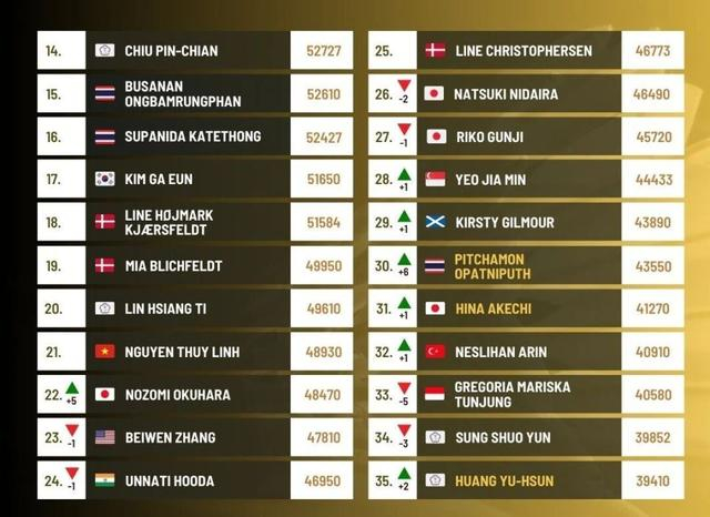 亚军碧查梦同样收获颇丰,排名飙升6位,来到第30名,同时刷新个人最高排名,这位19岁的泰国新星未来可期。日本名将奥原希望状态持续回归,排名上升5位至第22名,显然她的目标不止于此,超越宫崎友花、成为日本第二女单已是她的明确方向。