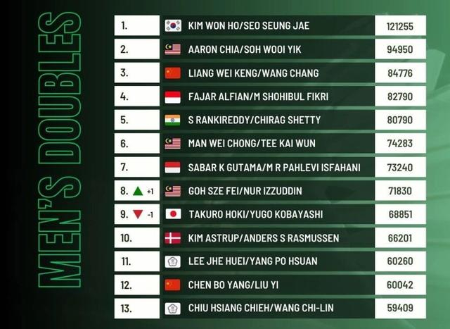 男双排名变动集中在中上游梯队,马来西亚组合吴世飞/努伊祖丁,凭借印尼大师赛冠军的积分优势,成功超越日本组合保木卓朗/小林优吾,排名重回前8,终结了自己的冠军荒。