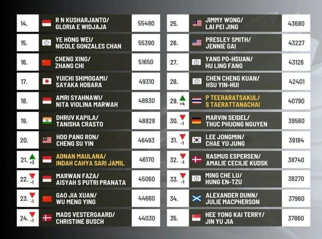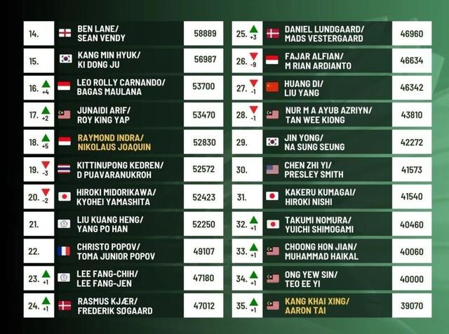 印尼小将组合同样表现亮眼,因陀罗/华金排名上升5位至第18名,卡尔南多/毛拉纳也有所进步,升至第16名。
