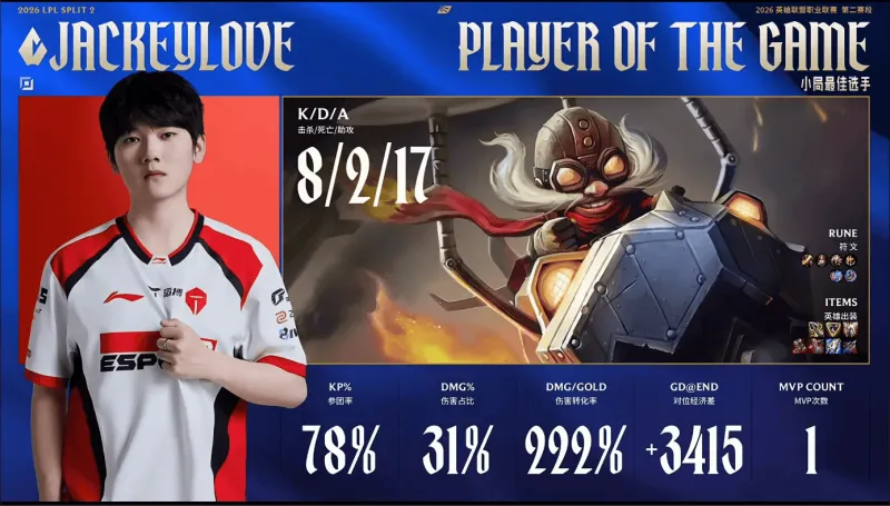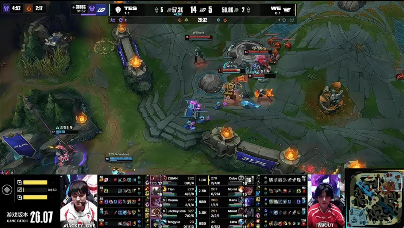 7分钟;双方下路河道爆发3V3,JackeyLove飞机收下About韦鲁斯。