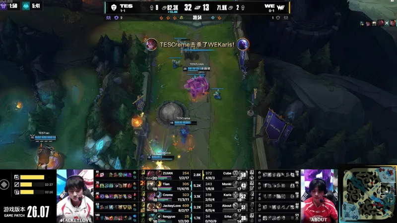 13分钟;TES四人上路抱团再次抓到机会击杀WE上辅。