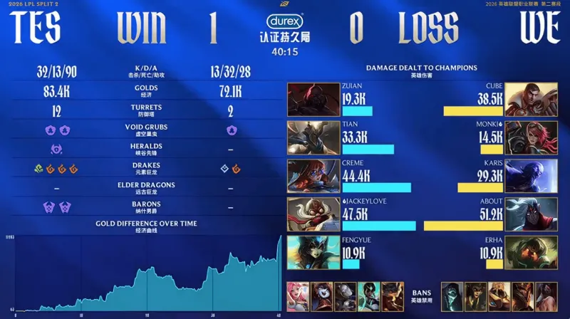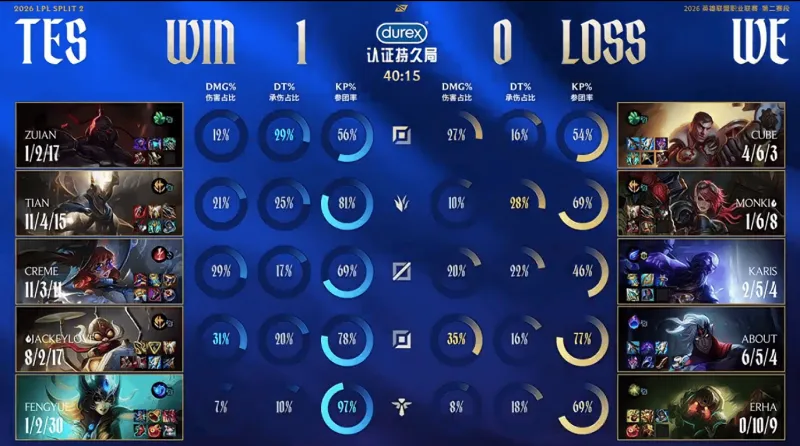 29分钟;TES携大龙BUFF击杀WE上辅后推掉中路高地
