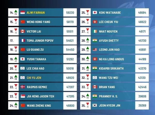 最让国羽球迷振奋的当属王正行!他终于打破连续一轮游的魔咒,在印尼大师赛取得突破性表现,排名随之上升4位,来到第24名。