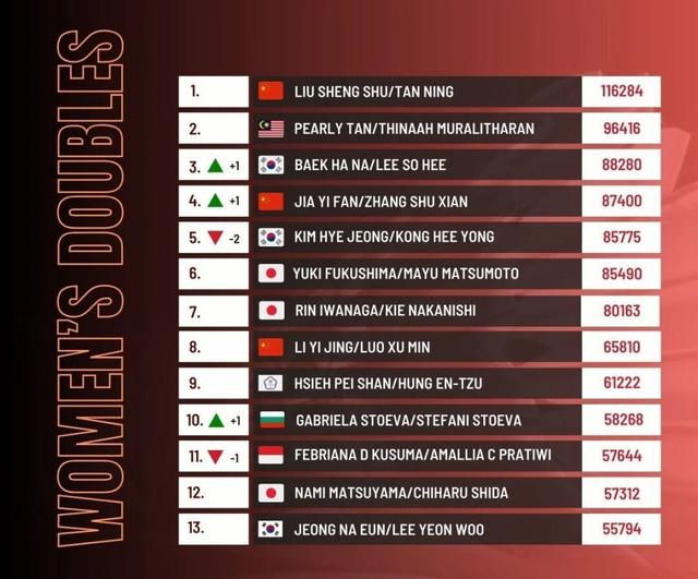 国羽王牌组合刘圣书/谭宁继续稳坐世界第一的宝座,统治力依旧。李怡婧/罗徐敏虽然目前排名第8,但积分已被前7名组合明显甩开,形成一个积分档位差,后续需要通过赛事尽快缩小差距。